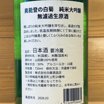 奥能登の白菊 純米大吟醸 無濾過生原酒 720ml 販売価格 4,180円(税込み) 会員価格 (税込み) 通常価格 (税込み) 在庫 △ 商品コード JANコード 4513299000485 数量 - + カートに入れる カテゴリー 奥能登の白菊(白藤酒造店/石川県輪島市) メーカー 株式会社 白藤酒造店 ブランド 奥能登の白菊 注文年齢制限 20歳 ~ 注文手続き画面にて、生年月日を入力いただきます。 要冷蔵の商品のためクール便での配送となります。あらかじめご了承ください。従量ポイント:1(従量ポイントとは、送料決定のための指数です。詳しくは、「送料について」のページをご確認ください。) RECOMMENDEDおすすめアイテム 遊穂 "YUHO PIANO" 純米吟醸生原酒 「G」 720ml 1,980円(税込み) 在庫切れ 能登末廣 純米酒 720ml 1,650円(税込み) 在庫切れ 竹葉 純米吟醸KZ 720ml 1,980円(税込み) 遊穂(生もと酵母無添加 生原酒) 木桶仕込 2025酒造年度 720ml 1,980円(税込み) 手取川 山廃 純米吟醸 720ml 2,310円(税込み) 奥能登の白菊 純米吟醸 無濾過生原酒 令和七年度新酒 720ml 2,750円(税込み) 竹葉 いか純米 720ml 1,980円(税込み) 遊穂 "YUHO PIANO" 純米吟醸生原酒 「a」 720ml 1,980円(税込み) 竹葉 能登純米 720ml 1,815円(税込み) 在庫切れ 池月 吟醸 みなもにうかぶ月 720ml 2,062円(税込み) 池月 純米酒 720ml 1,993円(税込み) 手取川 純米吟醸 生原酒 石川門 720ml 2,090円(税込み) 在庫切れ 能登末廣 特別純米しぼりたて 山田錦 720ml 1,980円(税込み) 在庫切れ 大江山GO 純米大吟醸 生原酒「百万石乃白」 720ml 3,410円(税込み) 在庫切れ 谷泉×手取川 山廃 貴醸酒 hope&shine 720ml 2,585円(税込み) 【輪島朝市ばあちゃんの味】干しほたるいか 594円(税込み) 能登誉 純米吟醸 720ml 2,156円(税込み) 竹葉 オイスター 純米酒 720ml 1,980円(税込み) 在庫切れ 宗玄 純米吟醸 無濾過生原酒 令和7酒造年度 720ml 2,365円(税込み) 「能登と共に」石川の地酒頒布会(720ml 2本セット計3回) 16,500円(税込み) 在庫切れ 【輪島朝市ばあちゃんの味】甘エビ素干し 594円(税込み) 宗玄 純米 石川門 無濾過生原酒 令和7酒造年度 720ml 1,595円(税込み) 谷泉 純米 720ml 1,980円(税込み) 在庫切れ 竹葉 活性にごり酒 720ml 1,650円(税込み) 在庫切れ 遊穂 純米酒 ゆうほのしろ 720ml 1,980円(税込み) 在庫切れ 遊穂 純米吟醸生原酒 うすにごり 「花さかゆうほ」 720ml 2,000円(税込み) 在庫切れ 宗玄 しぼりたて生原酒 720ml 1,430円(税込み) 在庫切れ 宗玄 純米 石川門 720ml 1,540円(税込み) 遊穂 純米酒 720ml 1,430円(税込み) 竹葉 能登純米 無濾過生原酒 720ml 2,090円(税込み) 在庫切れ CATEGORYカテゴリー ◆ 能登の日本酒 能登復興支援「能登と共に」石川の地酒頒布会 奥能登の白菊(白藤酒造店/石川県輪島市) 能登末廣(中島酒造店/石川県輪島市) 千枚田(清水酒造店/石川県輪島市) おれの酒(日吉酒造店/石川県輪島市) 竹葉(数馬酒造/石川県能登町) 谷泉(鶴野酒造店/石川県能登町) 大江山(松波酒造/石川県能登町) 宗玄(宗玄酒造/石川県珠洲市) 大慶(櫻田酒造/石川県珠洲市) 遊穂(御祖酒造/石川県羽咋市) 池月(鳥屋酒造/石川県中能登町) 有磯 曙(高澤酒造場/富山県) ◆ 石川・能登のひやおろし2025 ◆ 能登のワイン 能登ワイン ハイディワイナリー ◆ 能登の焼酎 ◆ 能登の酒粕 ◆ 能登のお酒ギフトセット 日本酒ギフト ◆ 金沢 & 加賀の日本酒 手取川・吉田蔵(吉田酒造店/石川県白山市) ◆ 石川県の果実のお酒 石川県の果実のお酒(梅酒など) ◆石川県のクラフトジン ◆ 富山県の日本酒 ◆ 全国の地酒 雪の茅舎(齋彌酒造店/秋田県) 松尾(高橋助作酒造店/長野県) 春鹿(今西清兵衛商店/奈良県) 土田(土田酒造/群馬県) ◆ ジャパニーズウイスキー ◆ 焼酎 蔵の師魂(小正醸造/鹿児島県) ◆ヨーグルトのお酒 2026年04月 日 月 火 水 木 金 土 1 2 3 4 5 6 7 8 9 10 11 12 13 14 15 16 17 18 19 20 21 22 23 24 25 26 27 28 29 30 2026年05月 日 月 火 水 木 金 土 1 2 3 4 5 6 7 8 9 10 11 12 13 14 15 16 17 18 19 20 21 22 23 24 25 26 27 28 29 30 31