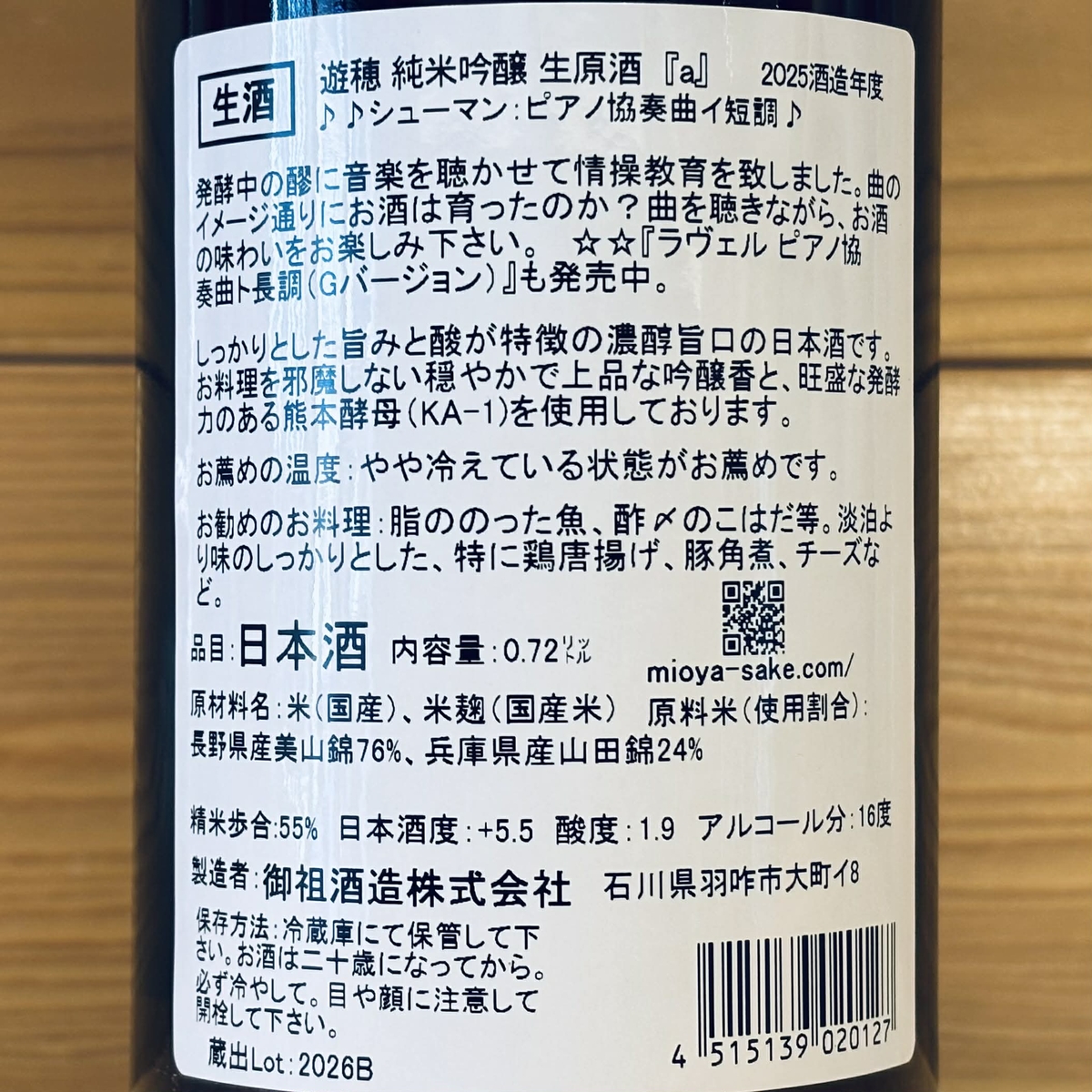 遊穂 "YUHO PIANO" 純米吟醸生原酒 「a」 720ml 毎年人気のYUHO PIANO♪ 販売価格 1,980円(税込み) 会員価格 (税込み) 通常価格 (税込み) 在庫 ○ 商品コード JANコード 数量 - + カートに入れる カテゴリー 遊穂(御祖酒造/石川県羽咋市) メーカー 御祖酒造株式会社 ブランド 遊穂 注文年齢制限 20歳 ~ 注文手続き画面にて、生年月日を入力いただきます。 要冷蔵の商品のためクール便での配送となります。あらかじめご了承ください。従量ポイント:1(従量ポイントとは、送料決定のための指数です。詳しくは、「送料について」のページをご確認ください。) RECOMMENDEDおすすめアイテム 能登末廣 特別純米しぼりたて 山田錦 720ml 1,980円(税込み) 遊穂(生もと酵母無添加 生原酒) 木桶仕込 2025酒造年度 720ml 1,980円(税込み) 在庫切れ 谷泉×手取川 山廃 貴醸酒 hope&shine 720ml 2,585円(税込み) 【輪島朝市ばあちゃんの味】干しほたるいか 594円(税込み) 奥能登の白菊 純米大吟醸 無濾過生原酒 720ml 4,180円(税込み) 能登誉 純米吟醸 720ml 2,156円(税込み) 竹葉 オイスター 純米酒 720ml 1,980円(税込み) 在庫切れ 宗玄 純米吟醸 無濾過生原酒 令和7酒造年度 720ml 2,365円(税込み) 「能登と共に」石川の地酒頒布会(720ml 2本セット計3回) 16,500円(税込み) 在庫切れ 竹葉 いか純米 720ml 1,980円(税込み) 手取川 純米吟醸 生原酒 石川門 720ml 2,090円(税込み) 【輪島朝市ばあちゃんの味】甘エビ素干し 594円(税込み) 宗玄 純米 石川門 無濾過生原酒 令和7酒造年度 720ml 1,595円(税込み) 大江山GO 純米大吟醸 生原酒「百万石乃白」 720ml 3,410円(税込み) 奥能登の白菊 純米吟醸 無濾過生原酒 令和七年度新酒 720ml 2,750円(税込み) 在庫切れ 谷泉 純米 720ml 1,980円(税込み) 在庫切れ 竹葉 活性にごり酒 720ml 1,650円(税込み) 在庫切れ 手取川 山廃 純米吟醸 720ml 2,310円(税込み) 遊穂 純米酒 ゆうほのしろ 720ml 1,980円(税込み) 在庫切れ 遊穂 "YUHO PIANO" 純米吟醸生原酒 「G」 720ml 1,980円(税込み) 遊穂 純米吟醸生原酒 うすにごり 「花さかゆうほ」 720ml 2,000円(税込み) 在庫切れ 宗玄 しぼりたて生原酒 720ml 1,430円(税込み) 在庫切れ 宗玄 純米 石川門 720ml 1,540円(税込み) 遊穂 純米酒 720ml 1,430円(税込み) 竹葉 能登純米 無濾過生原酒 720ml 2,090円(税込み) 在庫切れ 遊穂 純米無濾過生原酒 初しぼり 720ml 1,800円(税込み) 在庫切れ ハイディワイナリー QUARTET SPARKLING FLOWER 2024 カルテットスパークリングフラワー2024 750ml 4,180円(税込み) 在庫切れ 竹葉 しぼりたて生原酒 720ml 1,650円(税込み) 在庫切れ 竹葉 純米吟醸 無濾過生原酒 720ml 2,200円(税込み) 在庫切れ 竹葉 純米 無濾過生原酒 720ml 1,980円(税込み) 在庫切れ CATEGORYカテゴリー ◆ 能登の日本酒 能登復興支援「能登と共に」石川の地酒頒布会 奥能登の白菊(白藤酒造店/石川県輪島市) 能登末廣(中島酒造店/石川県輪島市) 千枚田(清水酒造店/石川県輪島市) おれの酒(日吉酒造店/石川県輪島市) 竹葉(数馬酒造/石川県能登町) 谷泉(鶴野酒造店/石川県能登町) 大江山(松波酒造/石川県能登町) 宗玄(宗玄酒造/石川県珠洲市) 大慶(櫻田酒造/石川県珠洲市) 遊穂(御祖酒造/石川県羽咋市) 池月(鳥屋酒造/石川県中能登町) 有磯 曙(高澤酒造場/富山県) ◆ 石川・能登のひやおろし2025 ◆ 能登のワイン 能登ワイン ハイディワイナリー ◆ 能登の焼酎 ◆ 能登の酒粕 ◆ 能登のお酒ギフトセット 日本酒ギフト ◆ 金沢 & 加賀の日本酒 手取川・吉田蔵(吉田酒造店/石川県白山市) ◆ 石川県の果実のお酒 石川県の果実のお酒(梅酒など) ◆石川県のクラフトジン ◆ 富山県の日本酒 ◆ 全国の地酒 雪の茅舎(齋彌酒造店/秋田県) 松尾(高橋助作酒造店/長野県) 春鹿(今西清兵衛商店/奈良県) 土田(土田酒造/群馬県) ◆ ジャパニーズウイスキー ◆ 焼酎 蔵の師魂(小正醸造/鹿児島県) ◆ヨーグルトのお酒 2026年04月 日 月 火 水 木 金 土 1 2 3 4 5 6 7 8 9 10 11 12 13 14 15 16 17 18 19 20 21 22 23 24 25 26 27 28 29 30 2026年05月 日 月 火 水 木 金 土 1 2 3 4 5 6 7 8 9 10 11 12 13 14 15 16 17 18 19 20 21 22 23 24 25 26 27 28 29 30 31