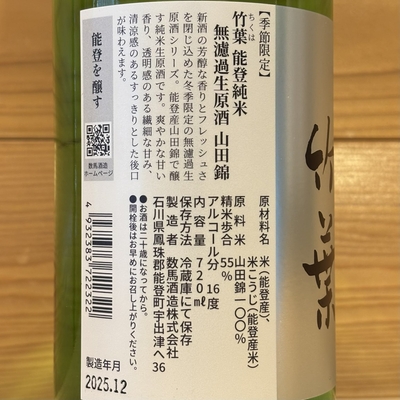 竹葉 能登純米 無濾過生原酒 720ml 販売価格 2,090円(税込み) 会員価格 (税込み) 通常価格 (税込み) 在庫 △ 商品コード JANコード 数量 - + カートに入れる カテゴリー 竹葉(数馬酒造/石川県能登町) メーカー 数馬酒造株式会社 注文年齢制限 20歳 ~ 注文手続き画面にて、生年月日を入力いただきます。 要冷蔵商品のためクール便での配送となります。あらかじめご了承ください。【お願い】梱包箱の都合上、720mlと1800mlの混載はできません。720mlと1800mlを同時にご注文される場合は、それぞれの容量で別々にご注文くださるようお願い致します。送料の自動計算の都合上、1回の注文につき、720mlは12本まで1800mlは6本までとさせて頂いております。従量ポイント:1(従量ポイントとは、送料決定のための指数です。詳しくは、「送料について」のページをご確認ください。) RECOMMENDEDおすすめアイテム 「能登と共に」石川の地酒頒布会(720ml 2本セット計3回) 16,500円(税込み) 能登誉 純米吟醸 720ml 2,156円(税込み) 竹葉 活性にごり酒 720ml 1,650円(税込み) ハイディワイナリー QUARTET SPARKLING FLOWER 2024 カルテットスパークリングフラワー2024 750ml 4,180円(税込み) 在庫切れ 遊穂 純米酒 ゆうほのしろ 720ml 1,980円(税込み) 竹葉 しぼりたて生原酒 720ml 1,650円(税込み) 在庫切れ 竹葉 純米吟醸 無濾過生原酒 720ml 2,200円(税込み) 在庫切れ 遊穂 純米無濾過生原酒 初しぼり 720ml 1,800円(税込み) 竹葉 純米 無濾過生原酒 720ml 1,980円(税込み) 在庫切れ 宗玄 純米 石川門 無濾過生原酒 令和7酒造年度 720ml 1,595円(税込み) 谷泉 純米 生原酒 720ml 1,980円(税込み) 在庫切れ 宗玄 本醸造にごり酒 720ml 1,265円(税込み) 在庫切れ 能登ワイン NselecTスパークリング・ロゼ(中口) 720ml 2,640円(税込み) 能登ワイン 心の雫(赤)辛口 720ml 3,520円(税込み) 手取川 純米 生原酒 しぼりたて 720ml 1,870円(税込み) 在庫切れ おれの酒 plus 純米酒 720ml 1,760円(税込み) 在庫切れ 宗玄 純米 石川門 720ml 1,540円(税込み) 在庫切れ 竹葉 純米吟醸 720ml 1,815円(税込み) 在庫切れ 白駒 大吟醸酒粕 500g 400円(税込み) 在庫切れ 【限定品】奥能登の本格焼酎 虎の涙 金箔入り 8年熟成 25度 720ml 3,300円(税込み) 在庫切れ 【能登の酒を止めるな!<第四弾>】被災日本酒蔵共同醸造支援プロジェクト「白駒」×「倉本」720ml 2,310円(税込み) 在庫切れ 【能登の酒を止めるな!<第四弾>】被災日本酒蔵共同醸造支援プロジェクト「谷泉」×「雅楽代」720ml 2,310円(税込み) 在庫切れ のとジン NOTO JIN 500ml 4,950円(税込み) 在庫切れ 宗玄 しぼりたて生原酒 720ml 1,430円(税込み) 大江山 復刻版 純米吟醸 720ml 1,980円(税込み) 在庫切れ 能登ワイン クオネス ヤマソーヴィニヨン 2023 720ml 6,600円(税込み) 本格麦焼酎 能登 5年熟成 720ml 2,145円(税込み) 大慶 純米酒 720ml 2,200円(税込み) 宗玄 純米「能登乃国」 720ml 1,540円(税込み) 在庫切れ のとジン NOTO JIN 250ml 3,300円(税込み) CATEGORYカテゴリー ◆ 能登の日本酒 奥能登の白菊(白藤酒造店/石川県輪島市) 能登末廣(中島酒造店/石川県輪島市) 千枚田(清水酒造店/石川県輪島市) おれの酒(日吉酒造店/石川県輪島市) 竹葉(数馬酒造/石川県能登町) 谷泉(鶴野酒造店/石川県能登町) 大江山(松波酒造/石川県能登町) 宗玄(宗玄酒造/石川県珠洲市) 大慶(櫻田酒造/石川県珠洲市) 遊穂(御祖酒造/石川県羽咋市) 池月(鳥屋酒造/石川県中能登町) 有磯 曙(高澤酒造場/富山県) ◆ 石川・能登のひやおろし2025 ◆ 能登のワイン 能登ワイン ハイディワイナリー ◆ 能登の焼酎 ◆ 能登の酒粕 ◆ 能登のお酒ギフトセット 日本酒ギフト ◆ 金沢 & 加賀の日本酒 手取川・吉田蔵(吉田酒造店/石川県白山市) ◆ 石川県の果実のお酒 石川県の果実のお酒(梅酒など) ◆石川県のクラフトジン ◆ 富山県の日本酒 ◆ 全国の地酒 雪の茅舎(齋彌酒造店/秋田県) 松尾(高橋助作酒造店/長野県) 春鹿(今西清兵衛商店/奈良県) 土田(土田酒造/群馬県) ◆ ジャパニーズウイスキー ◆ 焼酎 蔵の師魂(小正醸造/鹿児島県) ◆ヨーグルトのお酒 2026年01月 日 月 火 水 木 金 土 1 2 3 4 5 6 7 8 9 10 11 12 13 14 15 16 17 18 19 20 21 22 23 24 25 26 27 28 29 30 31 2026年02月 日 月 火 水 木 金 土 1 2 3 4 5 6 7 8 9 10 11 12 13 14 15 16 17 18 19 20 21 22 23 24 25 26 27 28