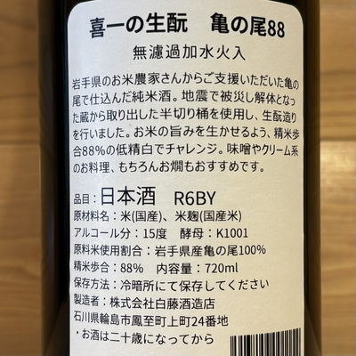 奥能登の白菊 喜一の生酛 亀の尾88 無濾過加水火入 720ml 販売価格 2,310円(税込み) 会員価格 (税込み) 通常価格 (税込み) 在庫 ○ 商品コード JANコード 数量 - + カートに入れる カテゴリー 奥能登の白菊(白藤酒造店/石川県輪島市) メーカー 株式会社 白藤酒造店 ブランド 奥能登の白菊 注文年齢制限 20歳 ~ 注文手続き画面にて、生年月日を入力いただきます。 従量ポイント:1(従量ポイントとは、送料決定のための指数です。詳しくは、「送料について」のページをご確認ください。) CATEGORYカテゴリー ◆ 能登の日本酒 奥能登の白菊(白藤酒造店/石川県輪島市) 能登末廣(中島酒造店/石川県輪島市) 千枚田(清水酒造店/石川県輪島市) おれの酒(日吉酒造店/石川県輪島市) 竹葉(数馬酒造/石川県能登町) 谷泉(鶴野酒造店/石川県能登町) 大江山(松波酒造/石川県能登町) 宗玄(宗玄酒造/石川県珠洲市) 大慶(櫻田酒造/石川県珠洲市) 遊穂(御祖酒造/石川県羽咋市) 池月(鳥屋酒造/石川県中能登町) 有磯 曙(高澤酒造場/富山県) ◆ 石川・能登のひやおろし2025 ◆ 能登のワイン 能登ワイン ハイディワイナリー ◆ 能登の焼酎 ◆ 能登の酒粕 ◆ 能登のお酒ギフトセット 日本酒ギフト ◆ 金沢 & 加賀の日本酒 手取川・吉田蔵(吉田酒造店/石川県白山市) ◆ 石川県の果実のお酒 石川県の果実のお酒(梅酒など) ◆石川県のクラフトジン ◆ 富山県の日本酒 ◆ 全国の地酒 雪の茅舎(齋彌酒造店/秋田県) 松尾(高橋助作酒造店/長野県) 春鹿(今西清兵衛商店/奈良県) 土田(土田酒造/群馬県) ◆ ジャパニーズウイスキー ◆ 焼酎 蔵の師魂(小正醸造/鹿児島県) ◆ヨーグルトのお酒 2025年11月 日 月 火 水 木 金 土 1 2 3 4 5 6 7 8 9 10 11 12 13 14 15 16 17 18 19 20 21 22 23 24 25 26 27 28 29 30 2025年12月 日 月 火 水 木 金 土 1 2 3 4 5 6 7 8 9 10 11 12 13 14 15 16 17 18 19 20 21 22 23 24 25 26 27 28 29 30 31
