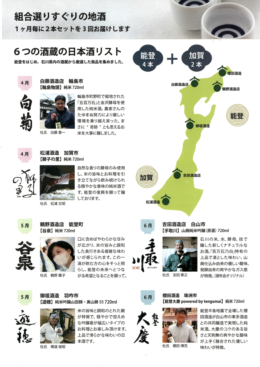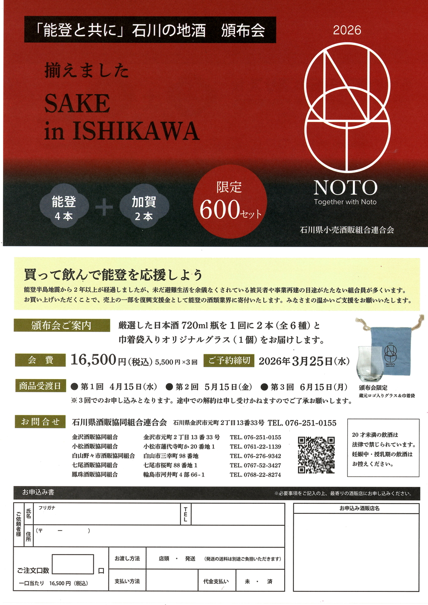 「能登と共に」石川の地酒頒布会(720ml 2本セット計3回) 【能登復興支援事業】買って飲んで能登を応援してください!600セット限定! 販売価格 16,500円(税込み) 会員価格 (税込み) 通常価格 (税込み) 在庫 ○ 商品コード JANコード 数量 - + カートに入れる カテゴリー ◆ 能登の日本酒 個別送料 3,300円 注文年齢制限 20歳 ~ 注文手続き画面にて、生年月日を入力いただきます。 この商品は他の商品と同梱出来ません。個別送料(4月、5月、6月の計3回分)¥3,300が自動入力されます。(北海道、沖縄を除く)北海道および沖縄への発送をご希望の方は、大変お手数ですが直接ご連絡くださいませ。 RECOMMENDEDおすすめアイテム 能登誉 純米吟醸 720ml 2,156円(税込み) 竹葉 活性にごり酒 720ml 1,650円(税込み) 竹葉 能登純米 無濾過生原酒 720ml 2,090円(税込み) ハイディワイナリー QUARTET SPARKLING FLOWER 2024 カルテットスパークリングフラワー2024 750ml 4,180円(税込み) 在庫切れ 遊穂 純米酒 ゆうほのしろ 720ml 1,980円(税込み) 竹葉 しぼりたて生原酒 720ml 1,650円(税込み) 在庫切れ 竹葉 純米吟醸 無濾過生原酒 720ml 2,200円(税込み) 在庫切れ 遊穂 純米無濾過生原酒 初しぼり 720ml 1,800円(税込み) 竹葉 純米 無濾過生原酒 720ml 1,980円(税込み) 在庫切れ 宗玄 純米 石川門 無濾過生原酒 令和7酒造年度 720ml 1,595円(税込み) 谷泉 純米 生原酒 720ml 1,980円(税込み) 在庫切れ 宗玄 本醸造にごり酒 720ml 1,265円(税込み) 在庫切れ 能登ワイン NselecTスパークリング・ロゼ(中口) 720ml 2,640円(税込み) 能登ワイン 心の雫(赤)辛口 720ml 3,520円(税込み) 手取川 純米 生原酒 しぼりたて 720ml 1,870円(税込み) 在庫切れ おれの酒 plus 純米酒 720ml 1,760円(税込み) 在庫切れ 宗玄 純米 石川門 720ml 1,540円(税込み) 在庫切れ 竹葉 純米吟醸 720ml 1,815円(税込み) 在庫切れ 白駒 大吟醸酒粕 500g 400円(税込み) 在庫切れ 【限定品】奥能登の本格焼酎 虎の涙 金箔入り 8年熟成 25度 720ml 3,300円(税込み) 在庫切れ 【能登の酒を止めるな!<第四弾>】被災日本酒蔵共同醸造支援プロジェクト「白駒」×「倉本」720ml 2,310円(税込み) 在庫切れ 【能登の酒を止めるな!<第四弾>】被災日本酒蔵共同醸造支援プロジェクト「谷泉」×「雅楽代」720ml 2,310円(税込み) 在庫切れ のとジン NOTO JIN 500ml 4,950円(税込み) 在庫切れ 宗玄 しぼりたて生原酒 720ml 1,430円(税込み) 大江山 復刻版 純米吟醸 720ml 1,980円(税込み) 在庫切れ 能登ワイン クオネス ヤマソーヴィニヨン 2023 720ml 6,600円(税込み) 本格麦焼酎 能登 5年熟成 720ml 2,145円(税込み) 大慶 純米酒 720ml 2,200円(税込み) 宗玄 純米「能登乃国」 720ml 1,540円(税込み) 在庫切れ のとジン NOTO JIN 250ml 3,300円(税込み) CATEGORYカテゴリー ◆ 能登の日本酒 奥能登の白菊(白藤酒造店/石川県輪島市) 能登末廣(中島酒造店/石川県輪島市) 千枚田(清水酒造店/石川県輪島市) おれの酒(日吉酒造店/石川県輪島市) 竹葉(数馬酒造/石川県能登町) 谷泉(鶴野酒造店/石川県能登町) 大江山(松波酒造/石川県能登町) 宗玄(宗玄酒造/石川県珠洲市) 大慶(櫻田酒造/石川県珠洲市) 遊穂(御祖酒造/石川県羽咋市) 池月(鳥屋酒造/石川県中能登町) 有磯 曙(高澤酒造場/富山県) ◆ 石川・能登のひやおろし2025 ◆ 能登のワイン 能登ワイン ハイディワイナリー ◆ 能登の焼酎 ◆ 能登の酒粕 ◆ 能登のお酒ギフトセット 日本酒ギフト ◆ 金沢 & 加賀の日本酒 手取川・吉田蔵(吉田酒造店/石川県白山市) ◆ 石川県の果実のお酒 石川県の果実のお酒(梅酒など) ◆石川県のクラフトジン ◆ 富山県の日本酒 ◆ 全国の地酒 雪の茅舎(齋彌酒造店/秋田県) 松尾(高橋助作酒造店/長野県) 春鹿(今西清兵衛商店/奈良県) 土田(土田酒造/群馬県) ◆ ジャパニーズウイスキー ◆ 焼酎 蔵の師魂(小正醸造/鹿児島県) ◆ヨーグルトのお酒 2026年01月 日 月 火 水 木 金 土 1 2 3 4 5 6 7 8 9 10 11 12 13 14 15 16 17 18 19 20 21 22 23 24 25 26 27 28 29 30 31 2026年02月 日 月 火 水 木 金 土 1 2 3 4 5 6 7 8 9 10 11 12 13 14 15 16 17 18 19 20 21 22 23 24 25 26 27 28