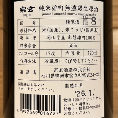 宗玄 純米 雄町 無濾過生原酒 令和7年度新酒 720ml 販売価格 1,925円(税込み) 会員価格 (税込み) 通常価格 (税込み) 在庫 ○ 商品コード JANコード 4997369016727 数量 - + カートに入れる カテゴリー 宗玄(宗玄酒造/石川県珠洲市) メーカー 宗玄酒造株式会社 ブランド 宗玄 注文年齢制限 20歳 ~ 注文手続き画面にて、生年月日を入力いただきます。 要冷蔵の商品のためクール便での配送となります。あらかじめご了承ください。 従量ポイント:1(従量ポイントとは、送料決定のための指数です。詳しくは、「送料について」のページをご確認ください。) CATEGORYカテゴリー ◆ 能登の日本酒 奥能登の白菊(白藤酒造店/石川県輪島市) 能登末廣(中島酒造店/石川県輪島市) 千枚田(清水酒造店/石川県輪島市) おれの酒(日吉酒造店/石川県輪島市) 竹葉(数馬酒造/石川県能登町) 谷泉(鶴野酒造店/石川県能登町) 大江山(松波酒造/石川県能登町) 宗玄(宗玄酒造/石川県珠洲市) 大慶(櫻田酒造/石川県珠洲市) 遊穂(御祖酒造/石川県羽咋市) 池月(鳥屋酒造/石川県中能登町) 有磯 曙(高澤酒造場/富山県) ◆ 石川・能登のひやおろし2025 ◆ 能登のワイン 能登ワイン ハイディワイナリー ◆ 能登の焼酎 ◆ 能登の酒粕 ◆ 能登のお酒ギフトセット 日本酒ギフト ◆ 金沢 & 加賀の日本酒 手取川・吉田蔵(吉田酒造店/石川県白山市) ◆ 石川県の果実のお酒 石川県の果実のお酒(梅酒など) ◆石川県のクラフトジン ◆ 富山県の日本酒 ◆ 全国の地酒 雪の茅舎(齋彌酒造店/秋田県) 松尾(高橋助作酒造店/長野県) 春鹿(今西清兵衛商店/奈良県) 土田(土田酒造/群馬県) ◆ ジャパニーズウイスキー ◆ 焼酎 蔵の師魂(小正醸造/鹿児島県) ◆ヨーグルトのお酒 2026年03月 日 月 火 水 木 金 土 1 2 3 4 5 6 7 8 9 10 11 12 13 14 15 16 17 18 19 20 21 22 23 24 25 26 27 28 29 30 31 2026年04月 日 月 火 水 木 金 土 1 2 3 4 5 6 7 8 9 10 11 12 13 14 15 16 17 18 19 20 21 22 23 24 25 26 27 28 29 30